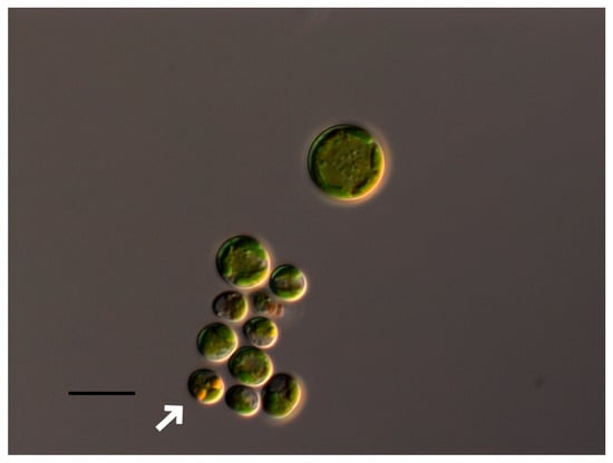 Oil-containing vacuoles in Bracteacccus minor cells (shown by white arrow). Scale bar 10 μm.