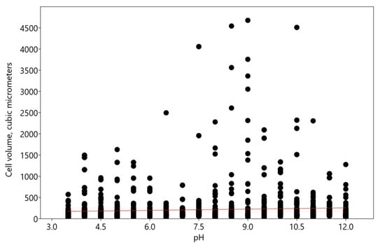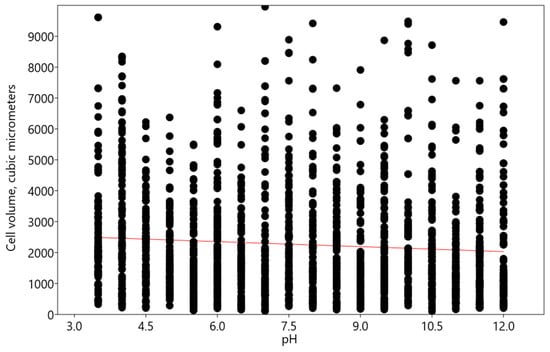Influence of pH on cell volume of Bracteacoccus minor. Red line indicates the regression trend.