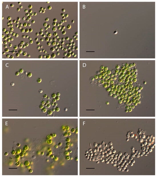 Influence of pH on Bracteacoccus minor morphology. (A) Control variant (pH 6.5); (B) pH 3; (C) pH 8.5; (D) pH 9; (E) pH 10.5; (F) pH 11. Scale bar 10 μm.
