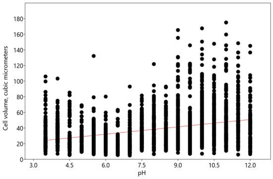 Influence of pH on cell volume of Chlorella vulgaris. Red line indicates the regression trend.