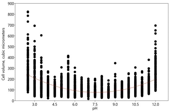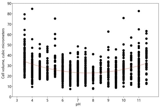The experiments revealed an increase in cell volume in the acidic and alkaline pH range, according to the polynomial regression model using equation y = 6.23x2 − 94.7x + 437.2 (χ2: 1.3735E07; AIC: 8.6522; R2: 0.28156; F: 471.47; p (regr): 1.7153 × 10−173) (Figure 11).