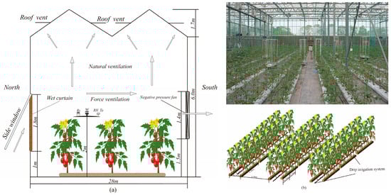 The experimental site was located in Xinxiang City, Henan Province (35°19′ N,113°53′ E; altitude: 73.2 m). The average annual temperature is 14.1 °C, the frost-free period lasts for 210 d, and the annual sunshine duration is 2398.8 h. The experiment was carried out in a Venlo greenhouse at the Xinxiang Comprehensive Experimental Base of the Chinese Academy of Agricultural Sciences. The greenhouse was situated north, facing south. The main frame was made from light, hot-dipped galvanized steel, and the outer sheath was made from 8 mm-thick double-layer glass, covering an area of 560 m2 (28 m × 20 m). The specific greenhouse structure information is shown in Figure 1a.