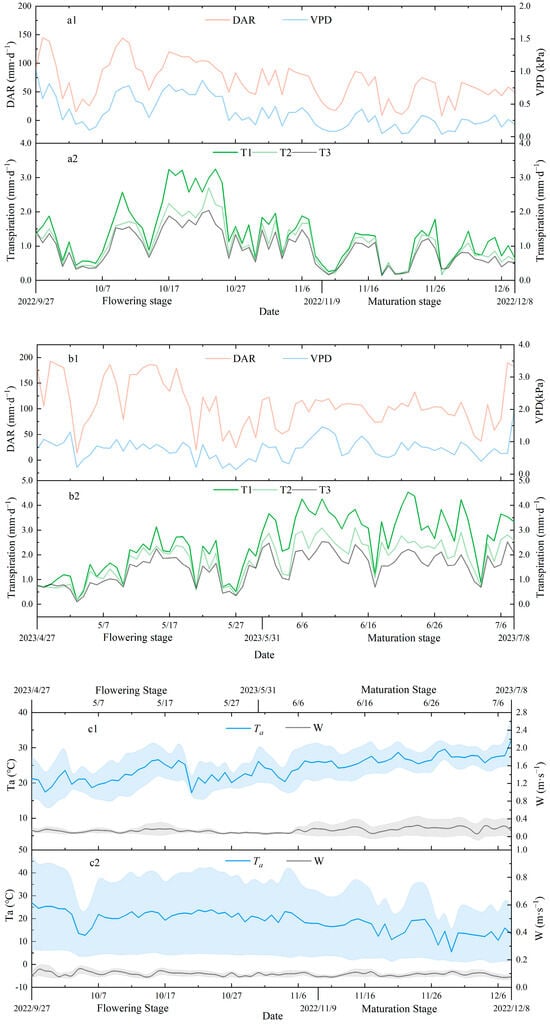 Variations in greenhouse microenvironmental factors and daily transpiration of tomatoes under different irrigation conditions in 2022 and 2023. DAR represents daily accumulated solar radiation, VPD represents daily averaged vapor deficit, Ta represents daily averaged air temperature, and W represents daily averaged wind speed. (a2,b2) are the variation of DAR in 2022 and 2023. (a1,b1,c1,c2) are the variation of microenvironmental factors in 2022 and 2023, the bule and grey area in (c1,c2) represents standard deviation of air temperature and wind speed recorded by the meteorological station every 30 min during a day, respectively.