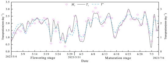 Comparison of simulated and measured values of daily transpiration; Ti represents the value simulated using the segmented model, T′ represents the value simulated using the unsegmented model, and Mi represents the measured value.