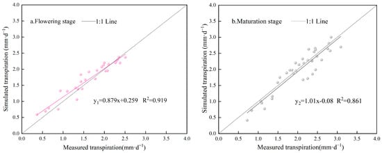 Figure 3 is the comparison between the daily measured and simulated values obtained by segmented modeling Ts and unsegmented modeling T′ in 2023. Table 7 depicts the comparison of the simulation accuracies of the Ts and T′ in the flowering and fruit-setting and picking stages. As shown in Figure 3 and Table 7, unsegmented modeling T′ underestimated the Tm at the flowering and fruit-setting stage, with a mean absolute error (MAE) and root-mean-square error (RSME) of 0.27 mm·d−1 and 0.34 mm·d−1, respectively, and an NSE of 0.66. The mean relative error MRE of the segmented model Ts was improved by 5% compared with that of the T′ model, and the MAE, RSME, and NSE were 0.15 mm·d−1, 0.18 mm·d−1, and 0.91, respectively, which were smaller than those of the T′ model. The simulation accuracies of the T′ model were improved during the maturation period, at 12.99%, 0.25 mm·d−1, and 0.30 mm·d−1 for the MRE, MAE, and RSME, respectively, while those of the Ts model were 11.07%, 0.20 mm·d−1, and 0.25 mm·d−1. In addition, the NSE of the Ts model simulation is 0.85, while the NSE of the T′ model is 0.73; thus, the Ts model was still better than the T′ model. Figure 4 shows the linear fit of the simulated and measured values of the segmented model Ts at the flowering and maturation stages. The correlation coefficients R2 of the Ts model at the flowering and maturation stages were 0.92 and 0.86, respectively. The synthesis of the statistical indicators in Table 7 and Figure 3 and Figure 4 shows that the simulation accuracy of the Ts model was higher than that of the T′ model; in addition, fewer parameters were required by the Ts model than by the T′ model. Therefore, the segmented model Ts was better than the unsegmented model T′, which could accurately simulate the daily transpiration of Venlo-type greenhouse substrate-cultivated tomatoes.