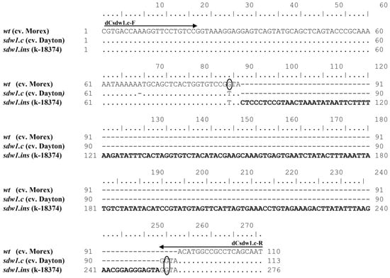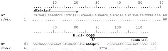 Sequence alignment flanked by the dCsdw1.c-F/R dCAPS primers for wild-type (from the MorexV3 genome assembly) and sdw1.c (cv. Deba Abed according to Xu et al., 2017 []) alleles of the HvGA20ox2 gene. The oval indicates the nucleotide that has been changed in the dCAPS-primer compared to the original gene sequence.