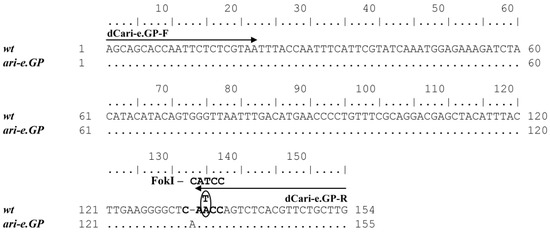 In a similar way, a dCAPS marker was developed for the insertion 1508 (+A) in the ari-e.GP allele of the HvDep1 gene. Due to a modification of the reverse primer sequence, the PCR product contained the restriction site CATCC (instead of the original CAACC), which allowed this mutation to be distinguished from all other alleles by FokI restriction (Figure 3 and Supplementary Table S1). The mechanism of the dCAPS marker for ari-e.GP allele action is similar: a restriction site is formed in the wild type during amplification, while the cutting of PCR products does not occur in the mutant allele ari-e.GP.