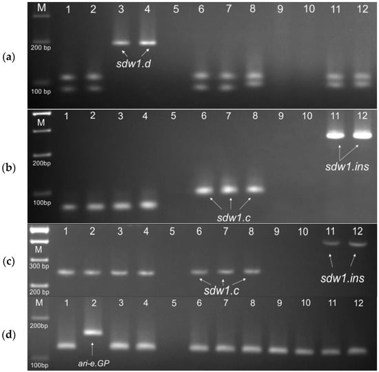 Identification of the sdw1/denso (HvGA20ox2) and ari-e (HvDep1) genes allelic composition: (a) sdw1.d allele of the sdw1/denso gene—CAPS marker (primers Hv20ox2-F/R + HaeIII); (b) sdw1.c allele of the sdw1/denso gene—dCAPS marker (dCsdw1.c-F/R + HpaII); (c) sdw1.c allele of the sdw1/denso (HvGA20ox2) gene—InDel marker (MC40861P3F/R); (d) ari-e.GP allele of the ari-e gene—dCAPS marker (primers dCari-e.GP-F/R + FokI). The numbers indicate barley accessions with different alleles of the sdw1/denso (HvGA20ox2), uzu1 (HvBRI1), and ari-e (HvDep1) genes: 1—Morex (wild type); 2—Golden Promise (ari-e.GP); 3—Diamant (sdw1.d); 4—Namoi (sdw1.d); 5—negative control (H2O); 6—Deba Abed (sdw1.c); 7—Potra (sdw1.c); 8—Shikokuhadaka N3 (sdw1.c and uzu1.a); 9—Yerong (sdw1.a/sdw1.e); 10—Karan 3 (sdw1.a/sdw1.e); 11—k-28184 (sdw1.ins); 12—C.I.10405 (sdw1.ins). M—100 bp molecular weight marker (SibEnzyme).