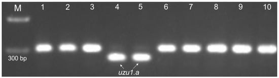PCR was carried out under standard conditions. The PCR with primers MC40861P3F/R and primers for detecting the uzu1.a allele used 20 μL of a reaction mixture that contained 40 ng of template DNA, 1× reaction buffer (Dialat, Moscow, Russia), 1.5 mM MgCl2, 0.3 mM of each dNTP, 200 nM of each forward and reverse primers (Evrogen, Moscow, Russia), and 1 unit of Taq polymerase (Dialat, Russia). For all other PCR primers, the mixture contained 2.5 mM MgCl2.