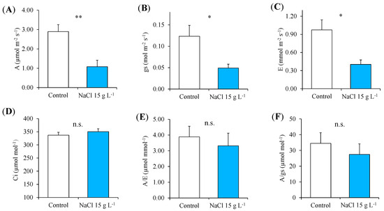 - James, R.A.; Rivelli, A.R.; Munns, R.; von Caemmerer, S. Factors affecting CO2 assimilation, leaf injury and growth in salt-stressed durum wheat. Funct. Plant Biol. 2002, 29, 1393–4032002. [Google Scholar] [CrossRef]