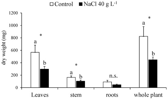 | roots | 31.82 ± 5.03 a | 10.21 ± 1.31 b | 17.26 | 0.006 | |