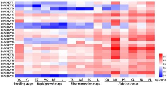 Figure 1. Expression pattern analysis of BnWRKYs. Relative expression of 25 BnWRKYs in the seedling stage (YS: stem bark; YL: leaves), rapid growth stage (TS: top of stem bark; MS: middle of stem bark; BS: bottom of stem bark; L: leaves), fiber maturation stage (TS: top of stem bark; MS: middle of stem bark; BS: bottom of stem bark; L: leaves), and under abiotic stress (CR, NR, and PR represent roots under control, NaCl, and PEG treatments, respectively; CL, NL, and PL represent leaves under control, NaCl, and PEG stresses, respectively).