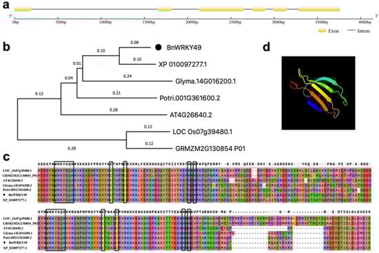 Figure 2. Bioinformatics alignment of BnWRKY49. (a) Gene structure of BnWRKY49. (b) Phylogenetic tree of BnWRKY49 and homologous genes in other species. (c) WRKY domains and conserved domains within proteins of the BnWRKY49 with homologous gene sequences in other species. Two WRKYGQK motifs and two C2H2 zinc-finger structures were labeled with black boxes. (d) Tertiary structure prediction model of the BnWRKY49 protein.