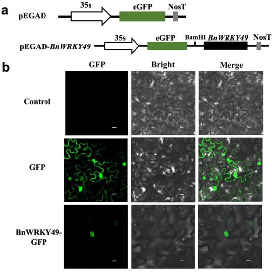 Figure 3. Subcellular localization of four BnWRKY49 proteins in tobacco leaves. (a) The structures of pEGAD-35S::BnWRKY49:GFP fusion vector and pEGAD-35S::GFP. (b) Green fluorescence images, bright field images, and the merge images overlay of bright and GFP were captured. The untreated tobacco leaves were used as a negative control to exclude autofluorescence. Tobacco leaves that were treated with an empty pEGAD vector were named GFP as a positive control. Bars, 20 μm.
