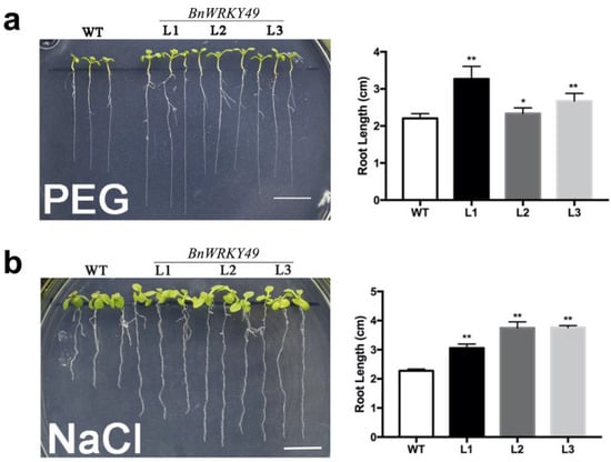 Figure 4. Assay of the root length of BnWRKY49 overexpression Arabidopsis seedlings under PEG and NaCl stress treatment. (a) The root growth of Arabidopsis seedlings in the final water potential of the PEG-infused plate (−0.75 MPa) for 7 d. (b) The root growth of Arabidopsis seedlings under 125 mM NaCl stress for 7 d. From left to right are WT and three BnWRKY49 overexpressing lines L1, L2, and L3, respectively. The error bars represent the mean (SD) of ten biological replicates (* p < 0.05, ** p < 0.01).