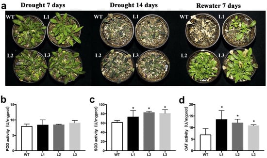 Figure 5. The phenotype of BnWRKY49-overexpressing Arabidopsis that were exposed to drought stress. (a) The phenotype of WT and three BnWRKY49-overexpressing lines (L1, L2, L3) exposed to drought stress for 7 and 14 days and rewatered for 7 days. (b) POD activity. (c) SOD activity. (d) CAT activity. The error bars represent the mean (SD) of three biological replicates (* p < 0.05).