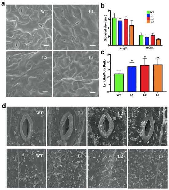 By phenotypic observation, the BnWRKY49-overexpressing lines showed increased tolerance to drought stress. From this, we speculated that the difference may be caused by the difference in stomatal closure under drought stress (Figure 6a). Compared with WT plants, the stomatal openings of transgenic plants were shorter and narrower, and the aspect ratio was larger (Figure 6b,c). We also analyzed the cuticular wax of the WT plants and transgenic plants under drought stress with a scanning electron microscope. The results showed that, compared with WT plants, the BnWRKY49-overexpressing lines had more wax crystals on the stem surface (Figure 6d).