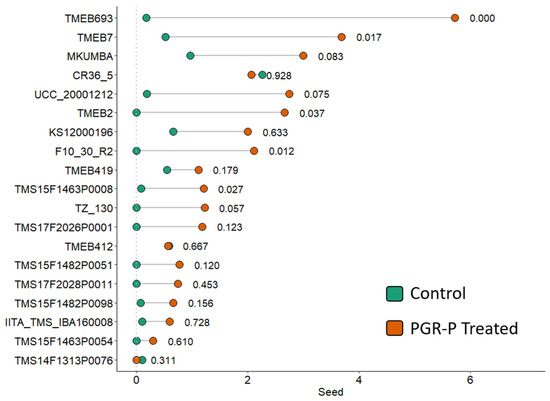 Seed produced per plant at the first tier of plants receiving control treatment vs. those treated with plant growth regulator and pruning (PGR-P) treatments in 19 genotypes over three years in Ubiaja. The p-values following the line segments indicate the probability that treatment differences from controls can be explained by chance alone.