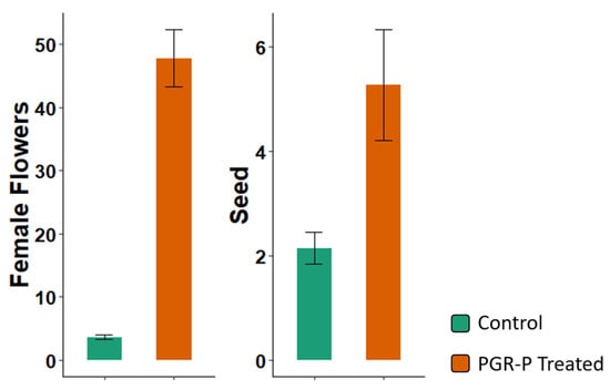 Flowers and seeds produced per plant in plants receiving control treatment vs. those treated with plant growth regulator and pruning (PGR-P) treatments using method M3. Shown are the averages ± SEM on the entire plant up to tier 4 in 19 genotypes over three years in Ubiaja.