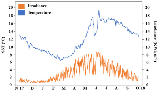 The western Irish climate is defined as temperate and is characterized by mean sea temperatures ranging from approximately 6 to 20 °C, with a lack of extreme warm or cold seasons. Data of daily sea surface temperatures (SST) were obtained from the National Oceanic and Atmospheric Administration (https://coastwatch.pfeg.noaa.gov/erddap/griddap/jplMURSST41.html; accessed 15 May 2020), and those of daily global irradiation on the horizontal plane at ground level (GHI) by Copernicus Atmosphere Monitoring Service (CAMS radiation service—SoDa (soda-pro.com; accessed 4 June 2020)).