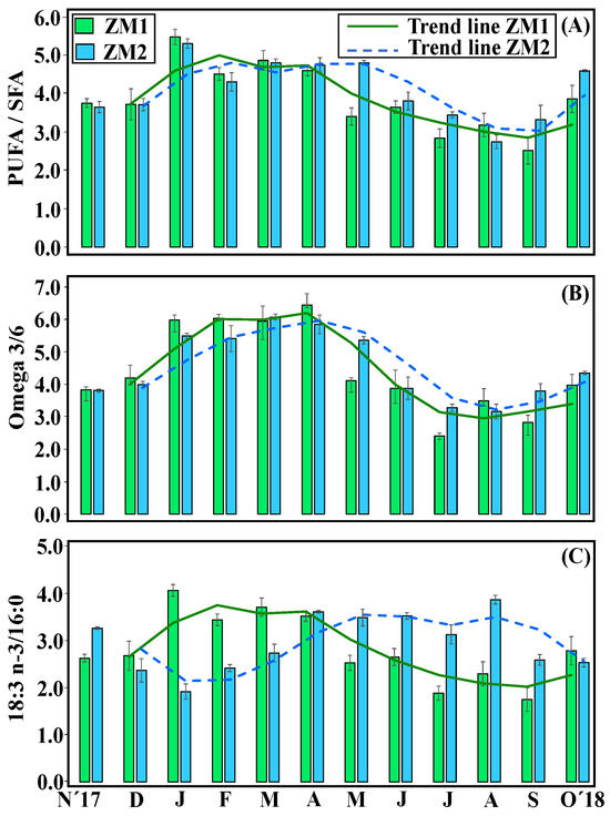 No significant differences in total fatty acids (TFAs) content were found between the two ecotypes (ZM1 = 2.2 ± 0.2% of DW; ZM2 = 2.1 ± 0.2% of DF) (Table S4). For both, higher TFA contents were observed in spring (ZM1 = 3.03 ± 0.054% of DW; ZM2 = 2.83 ± 0.2% of DW), while lowest values (ZM1 = 1.68% ± 0.11 of DW; ZM2 = 1.71 ± 0.16% of DW) were reached in August–September (Figure 4). Overall, PUFA/SFA, n-3/n-6 PUFA and the unsaturation index 18:3 n-3/16:0 displayed significant differences between the factors of ‘month’ and ‘ecotype’, and the interaction between these two factors was also significant (PERMANOVA, p < 0.05) (Table 3). Specifically, PUFA/SFA showed a strong seasonal trend, with maximum ratios observed in spring (ZM1 = 3.83 ± 0.03; ZM2 = 3.01 ± 0.06) and the lowest ratios in summer (ZM1 = 2.65 ± 0.05; ZM2 = 2.40 ± 0.02), coinciding with the warmest months (Table S3). Similarly, omega-3/6 displayed a significant seasonal trend, with maximum ratios in spring (ZM1 = 5.47 ± 0.11; ZM2 = 5.8 ± 0.13) and minimum ratios in summer (ZM1 = 3.01 ± 0.17; ZM2 = 3.4 ± 0.09) (Figure 5). However, regarding 18:3 n-3/16:0, both ecotypes showed different seasonal responses; ZM1 reached maximum values in the coldest months (January–February), whereas ZM2 contained maximum levels in April–May. Both ecotypes had lowest annual levels in the warmer months in August–September (Figure 5).