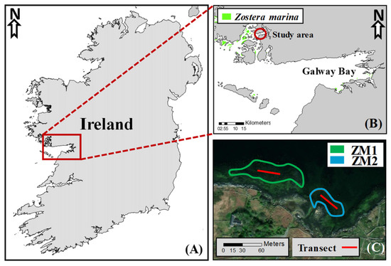 Map of Ireland (A). The red rectangle represents the study area (53°19′35″ N; 9°36′58″ W) in Kilkieran Bay, Co. Galway, showing the general distribution of seagrass meadows (green) (B). The ecotype 1 (ZM1) is represented in green, and the ecotype 2 (ZM2) in blue (C).