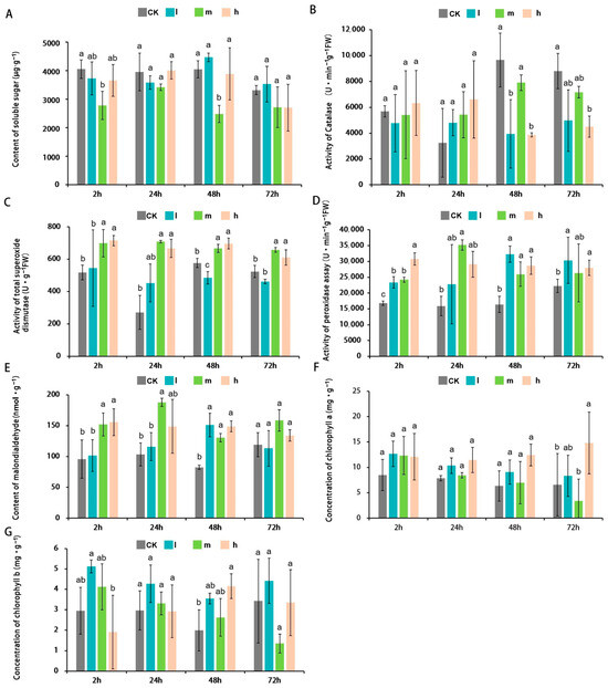 Physiological characteristics of M. tricuspidata under salt stress. (A) Content of soluble sugar. (B–D) Activities of CAT, SOD, and POD. (E) Content of MDA. (F,G) Concentration of chlorophyll a and b. CK, 0 mM NaCl; l, 34 mM NaCl; m, 68 mM NaCl; h, 102 mM NaCl. Different letters indicate a statistically significant difference when analyzed by one-way ANOVA and a multiple comparisons using Duncan’s method at p ≤ 0.05.