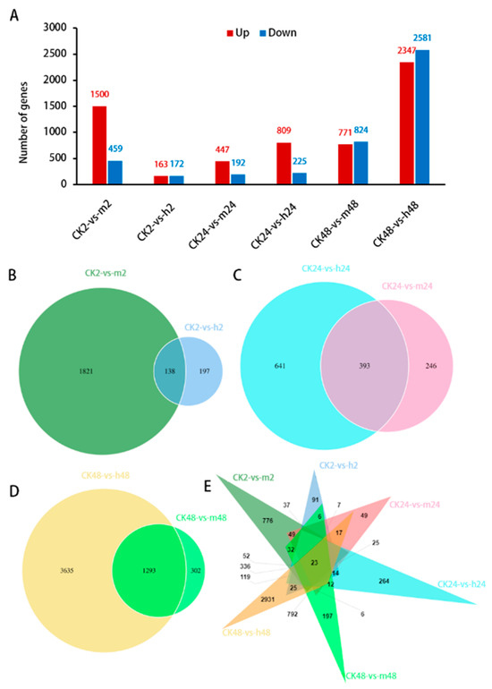 The number of DEGs in different comparison groups (CK2-vs.-m2, CK2-vs.-h2, CK24-vs.-m24, CK24-vs.-h24, CK48-vs.-m48, and CK48-vs.-h48). (A) Number of up and down DEGs in six comparison groups. (B) Common DEGs under two comparison groups under 2 h treatment. (C) Common DEGs under two comparison groups under 24 h treatment. (D) Common DEGs under two comparison groups under 48 h treatment. (E) Common DEGs among six comparison groups.