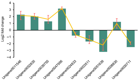 Nine DEGs in the CK48-vs.-h48 comparison were randomly selected for qRT-PCR validation (Figure 4). The expression patterns of these nine genes were consistent with the transcriptomic data, with a correlation coefficient (R) of 0.9932, suggesting that the gene expression patterns detected by RNA-seq are reliable.
