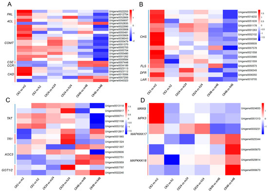 Genes involved in flavonoid biosynthesis, including chalcone synthase (CHS), flavonol synthase (FLS), dihydroflavonol 4-reductase (DFR), and leucoanthocyanidin reductase (LAR), were significantly enriched in all six comparison groups (Figure 7B). Interestingly, these four genes exhibited completely opposite expression patterns between the CK2-vs.-m2 (upregulated change) group and the CK48-vs.-h48 group (downregulated change).