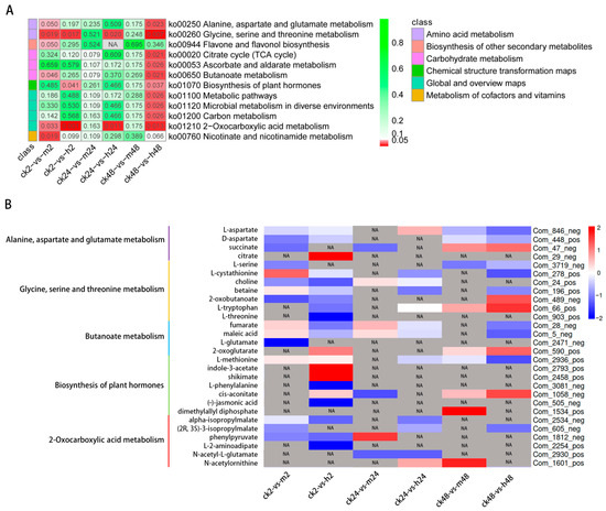 Four metabolites (fumarate, maleic acid, L-glutamate, and 2-oxoglutarate) involved in butanoate metabolism were found to be significantly enriched in the first and sixth comparison groups. Fumarate and maleic acid showed a slight increase at 2 h and 24 h under the m treatment, while the abundance of 2-oxoglutarate increased under the h treatment at 2 h and 48 h.