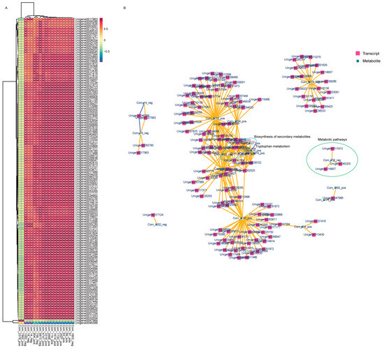 Pearson correlation coefficient was used to evaluate the relationship between DEGs and DMAs. Ultimately, the top 250 DEGs were selected based on their correlation coefficients with DMAs. The expression heatmap of these DEGs and DMAs was shown in Figure 9A. It can be observed that the DMA of Com_2378_pos and Com_7892_pos were significantly positively correlated with other DEGs (except Unigene0047966), while Unigene0047966 was positively correlated with other DMAs, and Unigene0046388 was positively correlated with all DMAs. Moreover, a network diagram of the correlation coefficients between these DEGs and DMAs is presented in Figure 9B. The biosynthesis of secondary metabolites, tryptophan metabolism, and metabolic pathways were prominent, indicating that these three pathways may play a pivotal part in the transcriptional and metabolic response to salt stress.