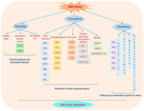 Plants develop a variety of physiological and biochemical adaptive mechanisms in response to soil salt stress, known as the plant salt stress response [7]. These mechanisms primarily revolve around regulating ion, osmotic, and nutrient balances, and scavenging ROS [8]. Collectively, these processes enable plants to adapt and survive in environments with high salt concentrations. Studies have shown significant changes in plants in response to salt stress, including oxidative and ion balances and osmotic adjustment [9,10]. ROS is vitally important in responding to stress perception, integrating various stress response signaling networks, activating and domesticating plant defense mechanisms [11]. Under salt stress, plants have the ability to activate enzymatic and non-enzymatic systems to protect cells from ROS toxicity [12,13]. The enzymatic system is composed of antioxidant enzymes, such as catalase (CAT), peroxidase (POD), and superoxide dismutase (SOD) [14]. Non-enzymatic systems generate metabolites that help to eliminate ROS from cells during salt stress, such as ascorbic acid, alkaloids, carotenoids, flavonoids, glutathione, phenolic compounds, and melatonin [7,14,15,16].