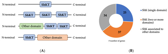 Representation and distribution of the main ShK domain-containing proteins predicted in B. xylophilus. (A) Representation of the architecture and position of the ShKT domain in ShK domain-containing proteins: one domain ShKT; multidomain ShKT and domain ShKT associated with other domains; (B) distribution of ShK domain-containing proteins predicted in the B. xylophilus transcriptome.