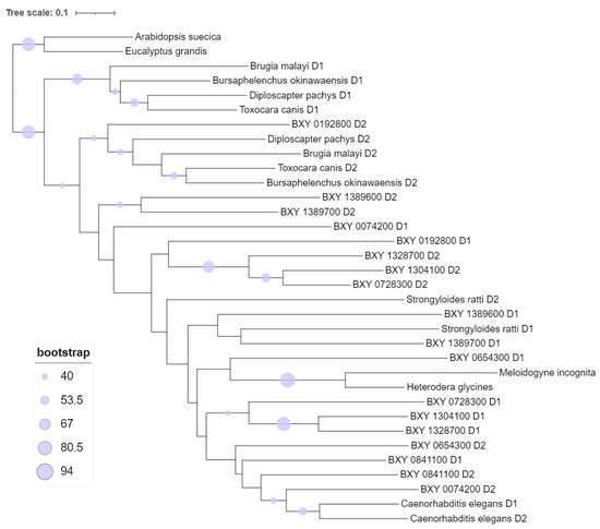 To perform the phylogeny analysis, we aligned the sequence domains of the nine candidate transcripts putatively specific to B. xylophilus with sequence domains from other nematodes and plants (Supplementary Data Table S1). Therefore, a maximum-likelihood (ML) (Figure 3) and a neighbor-joining (Supplementary Data Figure S1) phylogeny trees were constructed. The multiple sequence alignment revealed that ShKT D1 domain sequences were more similar to each other than the ShKT D2 domain. The same pattern was also observed within ShKT D2 domain sequences. The ML tree showed two clades: one with ShKT domain sequences of plants, considered an outgroup (A. suecica KAG7546197 and Eucalyptus grandis XP_010033232); and the other clade with ShKT domain sequences from Nematoda. In this last clade, several sub-clades are formed. The first sub-clade is composed of animal-parasitic species B. malayi (VIO92324) and T. canis (KHN87551), and free-living nematodes B. okinawaensis (CAD5214648) and Diploscapter pachys (PAV73547) (domain 1). The second sub-clade presents several clusters, from which the first is formed with domain 2 of the same species previously shown in the first sub-clade. In fact, the full protein sequences of these two sub-clades are associated with other domains, such as the di-copper center-containing domain and the tyrosinase domain. Another cluster in the second sub-clade is grouped into the nine B. xylophilus domains with Strongyloides ratti (CEF69303) (animal-parasitic) and C. elegans (CCD70350) (free-living) (D1 and D2). Also, this cluster showed M. incognita (Minc3s00855g18130) and H. glycines (Hetgly.G000014452) (plant-parasitic) with a significant bootstrap (higher than 90%) sharing a single ShKT domain. Some candidate genes (BXY_0192800 D1, BXY_0074200 D1, BXY_1389600 D1, BXY_1389700 D1, and BXY_0654300 D1) have a low bootstrap (<40%); therefore, it is not possible to infer their relation in the tree. However, BXY_1304100 D1 and BXY_1328700_D1 have a significant bootstrap (89%). These data may suggest that these genes putatively specific to B. xylophilus could be obtained independently from the others, and they do not evolve as a result of duplication of a single ancestor.