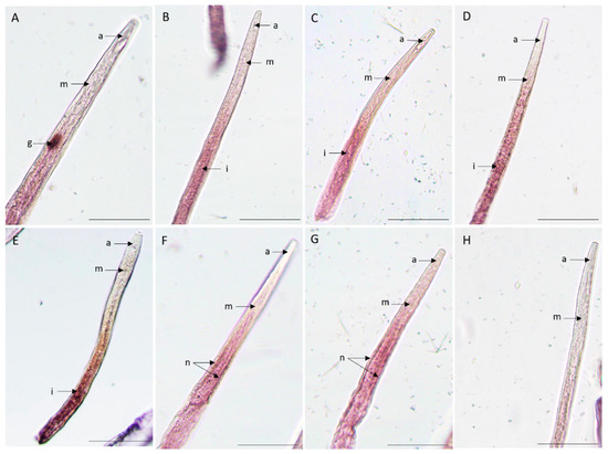 Detection of nine candidate genes, ShK domain-containing proteins, and B. xylophilus transcripts by in situ hybridization. Transcripts were localized in different tissues of the nematode using the complementary anti-sense DIG-labeled probes. (A) BXY_0728300, (B) BXY_1389600, (C) BXY_0074200, (D) BXY_0192800, (E) BXY_0654300, (F) BXY_0841100, (G) BXY_1389700, and (H) sense probe (control). The different nematode anterior sections of the body are labeled as follows: a: anterior region; g: pharyngeal gland cells; i: intestine region; m: median bulb; n: nervous system. Bars = 20 μm.