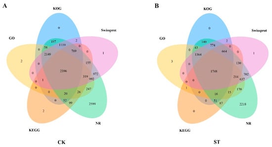 The newly acquired transcripts from the two libraries underwent functional annotation in five databases, namely the GO, KEGG, Non-Redundant Protein Database (NR), Swissprot, and Clusters of Orthologous Groups (KOG). Specifically, 12,501 distinct transcripts in the CK library were annotated in GO (49.68%), KEGG (30.71%), NR (97.34%), Swissprot (70.99%), and KOG (54.10%), resulting in a total of 12,177 gene transcript annotations (Figure 1A). On the other hand, the annotation rates for the 9291 unique transcripts in the ST library across the databases were GO (45.32%), KEGG (31.49%), NR (96.58%), Swissprot (67.12%), and KOG (51.68%), resulting in a total of 8980 gene transcript annotations (Figure 1B).
