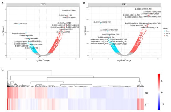 Volcano plots of the DEGs and DETs of CK and ST and the cluster analysis of the DEGs. (A) The red color indicates the upregulated genes and the light blue color indicates the downregulated genes. (B) The red color indicates the upregulated transcripts and the light blue color indicates the downregulated transcripts. (C) The rows indicate the samples; the columns indicate the different genes. The colors indicate the expression levels of the genes in the samples as determined by RPG10K.