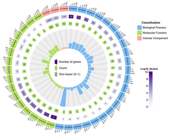 GO enrichment analysis for DEGs. The initial circle exhibits the identification data of GO, where the distinct hues represent various Gene Ontologies. Subsequently, the second circle displays the quantity and Q values of the GO elements within the background gene set, with lengthier bars and darker shades suggesting a larger number of genes and a lower Q value, respectively. The third circle showcases the count of DEGs annotated to GO items, with lengthier bars symbolizing a greater number of genes. Lastly, the fourth circle reveals the ratio between the number of DEGs annotated to a particular GO item and the number of genes annotated to said GO item within the background gene set. Furthermore, gridlines divide the background into increments of 0.1.
