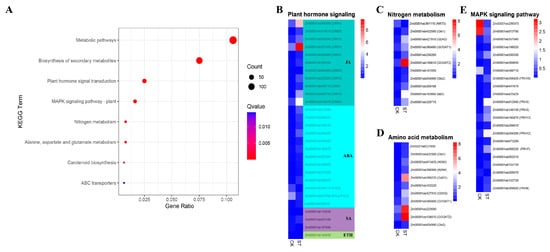 KEGG pathway enrichment analysis and heat map of the expression of genes related to plant hormone signaling, nitrogen metabolism, amino acid metabolism, and the MAPK signaling pathways (A) The y-axis indicates the pathway of the KEGG, and the gene ratio on the x-axis indicates the ratio of the number of DEGs annotated to this pathway to the number of genes in the background genes annotated to this pathway. (B–E) The columns indicate the samples and the rows indicate the different genes. The color indicates the expression level of the gene in the sample as determined by RPG10K.