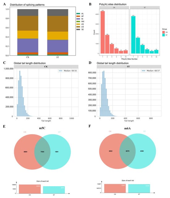 Distribution of each variable shear event, a plot of the number of genes with different numbers of APA sites, and a plot of the overall poly(A) tail length within the sample. (A) The diverse colors correspond to distinct AS events, while the size of the graph signifies the proportion of a specific AS event relative to the total AS events. (B) The x-axis denotes the number of distinct APA sites, while the y-axis represents the amount of genes displaying varying numbers of APA sites. (C,D) The x-axis indicates the RNA poly(A) tail length, while the y-axis indicates the amount of RNA possessing different poly(A) tail lengths. (E) The orange color indicates the number of transcripts where m5C was present in CK, the light blue color represents the number of transcripts where m5C was observed in ST, and the overlapping region indicates the number of transcripts where m5C co-occurred in both groups. (F) The orange color signifies the number of transcripts in CK featuring m6A, the light blue color corresponds to the number of transcripts in ST with m6A, and the intersection denotes the number of transcripts where m6A was simultaneously present in both groups.
