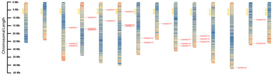 Chromosomal localization of PaSWEETs genes and their distribution on whole-genome chromosomes. Each bar represents chromosomes. The chromosome numbers are shown on the left side, and the gene names are presented on the right side. The location of each gene is displayed on the line bar.