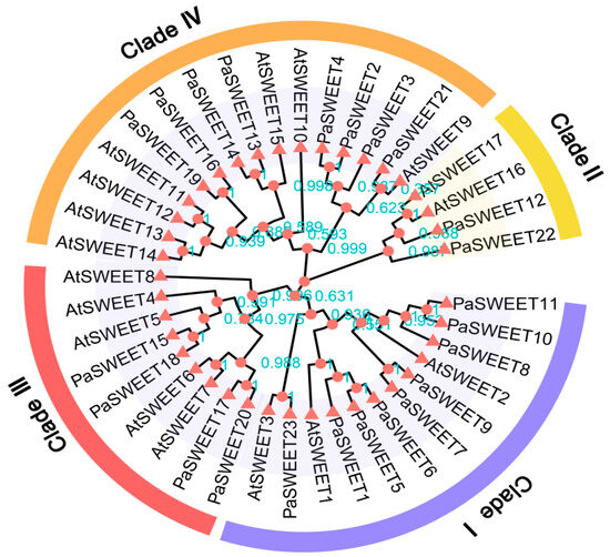 For a better understanding of the evolution of PaSWEET genes, a phylogenetic tree was constructed by combining 23 PaSWEET genes with 17 SWEET genes of Arabidopsis thaliana (AtSWEETs) that were previously reported. The analysis of these 40 SWEET genes (23 PaSWEET + 17 AtSWEETs) through a phylogenetic tree indicated that they were divided into four main clades (Clade I, Clade II, Clade III, and Clade IV) (Figure 2). The detailed distribution of these SWEETs in each clade is as follows: Clade I (9, 3), Clade II (2, 2), Clade III (4, 5), and Clade IV (8, 7). A total of 23 identified PaSWEET genes were distributed into four different clades.