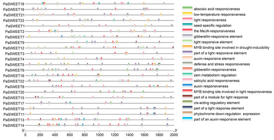 The 2000 bp upstream sequence of the coding region of PaSWEETs was submitted to the PlantCARE software, version 1.58 (https://bioinformatics.psb.ugent.be/webtools/plantcare/html, accessed on 22 November 2023), and cis-acting elements were identified [67].