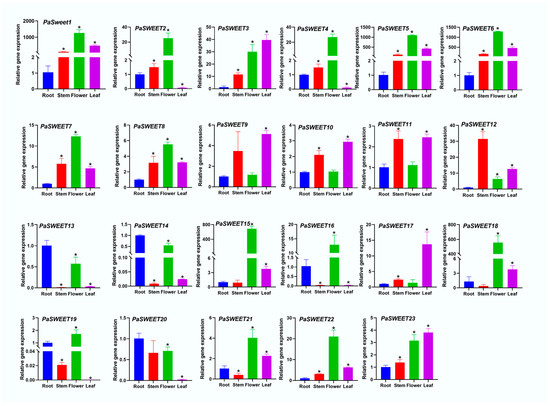 Relative fold gene expression of PaSWEETs genes in different sampled tissues. The X-axis represents different tissues (roots, stems, flowers, and leaves), and the relative gene expression is shown on Y-axis. Asterisks are representing the significant expression results among different tissues.