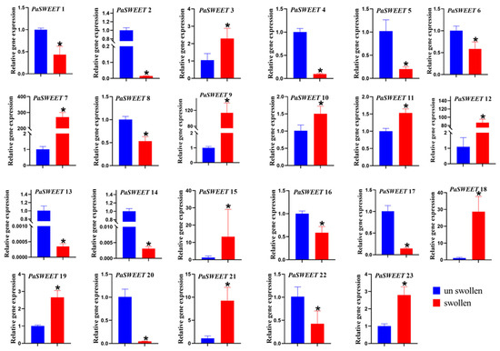 Relative expression levels of PaSWEETs genes in swollen and unswollen tubers. The X-axis represents swollen (red box) and unswollen tubers (blue box), and the relative gene expression is shown on Y-axis. Asterisks are representing the significant expression results between swollen and unswollen tubers.