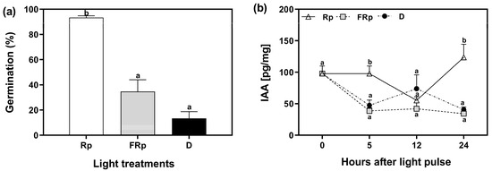 - Lee, K.P.; Piskurewicz, U.; Turečková, V.; Carat, S.; Chappuis, R.; Strnad, M.; Fankhauser, C.; Lopez-Molina, L. Spatially and Genetically Distinct Control of Seed Germination by Phytochromes A and B. Genes Dev. 2012, 26, 1984–1996. [Google Scholar] [CrossRef]