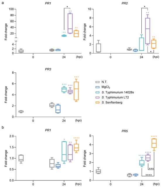 Expression of pathogenesis-related (PR) proteins encoding genes in Arabidopsis (a) and lettuce (b) challenged with individual Salmonella strains (S. Typhimurium 14028s, S. Typhimurium LT2, or S. Senftenberg). Fold changes were calculated by normalizing data to non-treated (N.T.) plants 0 h post inoculation (hpi). Five biological replicates were used. Bar ends represent maximum and minimum values, and the horizontal lines in boxes represent first quartile, median, and third quartile, respectively. Unpaired Student’s t-test was used to verify the difference between single Salmonella strain and MgCl2 treated plants 24 hpi. One-way ANOVA with Tukey HSD test was additionally used to compare the expression in the samples treated with different Salmonella strains. * p < 0.05; ** p < 0.01; *** p < 0.001; **** p < 0.0001.