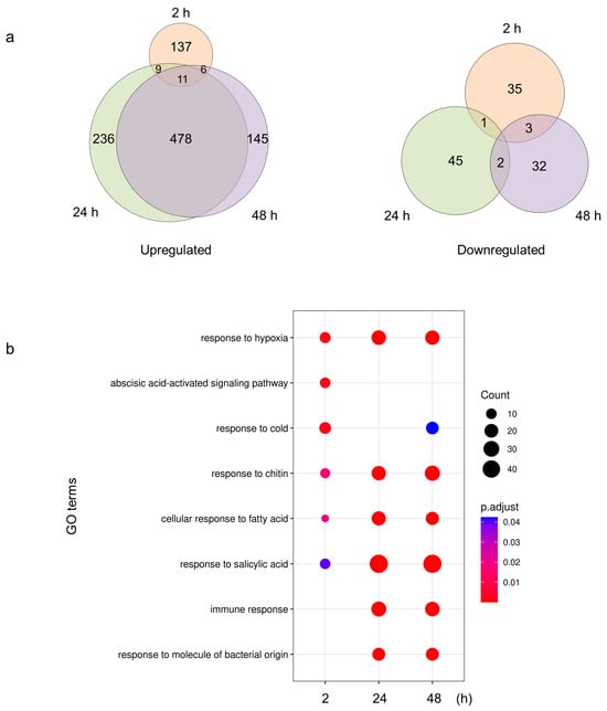 Transcriptional responses of tomato plants to S. Typhimurium 14028s 2, 24, and 48 hpi. Four biological replicates were prepared for each treatment. Differentially expressed genes (DEGs) were determined by the threshold of adjusted p < 0.05 and |log2fold change| > 0.59 using DESeq2. Up and downregulated genes were shown (a) and significantly enriched gene ontology (GO) terms were identified (b).