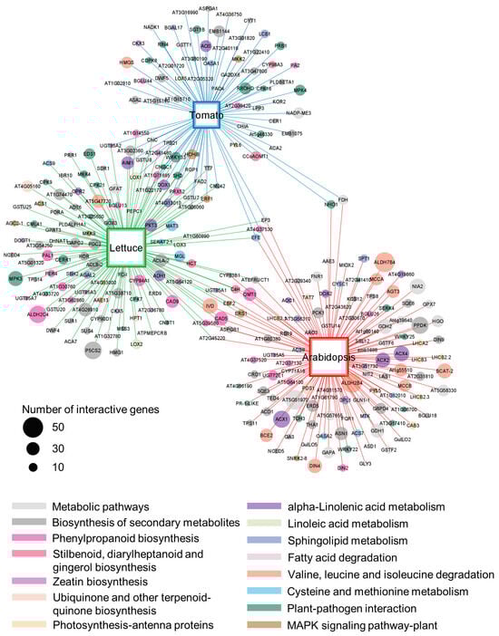 Comparison of transcriptomes in Arabidopsis, lettuce, and tomato inoculated with S. Typhimurium 14028s 24 h. Circle color indicates pathway of enriched KEGG as annotated in the legend. Size of the circle represents interactive gene number. Size of the squares indicate number of genes identified in plants. Genes identified in Arabidopsis, lettuce, and tomato are linked in red, green, and blue lines, respectively.